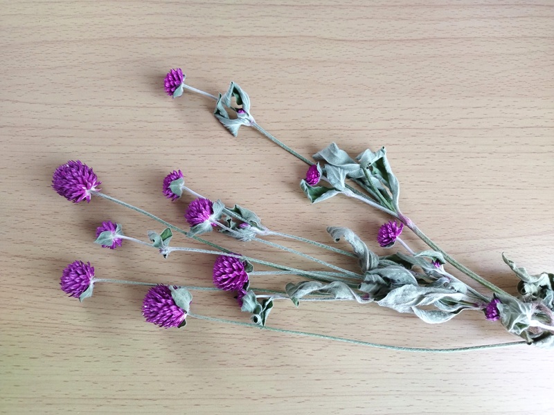 (写真3:ドライフラワーにした千日紅が紫に変化)