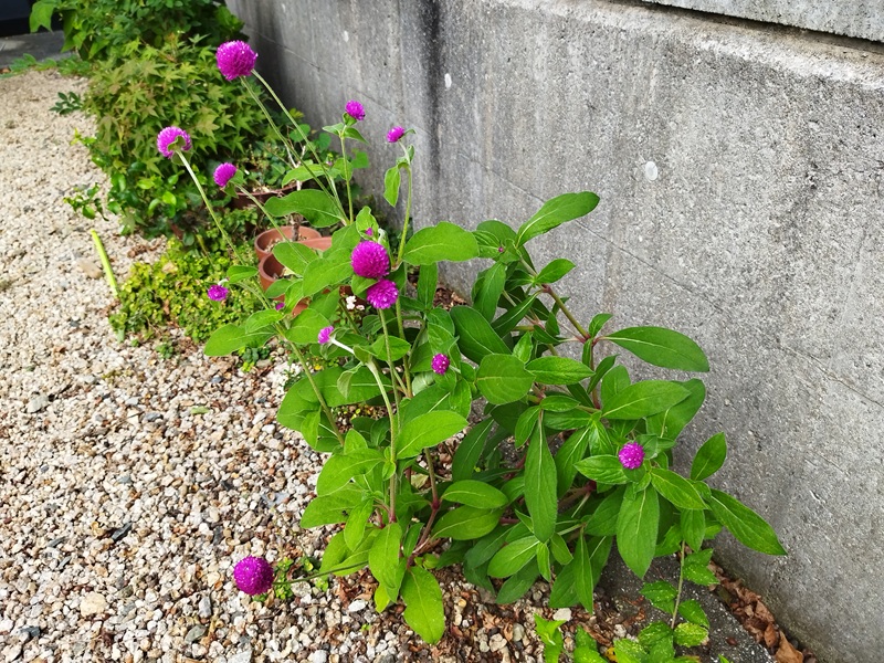 庭に咲く濃いピンク色の千日紅の花をアップで撮影した写真